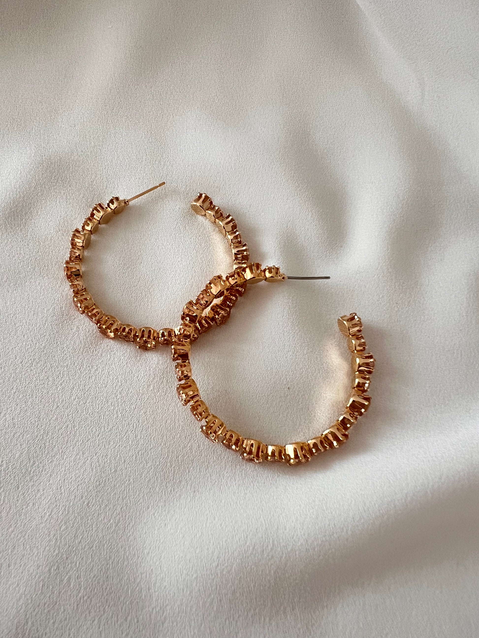 Orecchino in Bronzo, con galvanica Dorata e pietre dure color champagne. Anallergico e privo di Nichel e Cadio con chiusura a farfallina. Diametro 4,5 cm. Prezzo a coppia. Made in Italy. Le Luci di Gaia Gioielli in Argento 925. Spedizione in tutta Italia