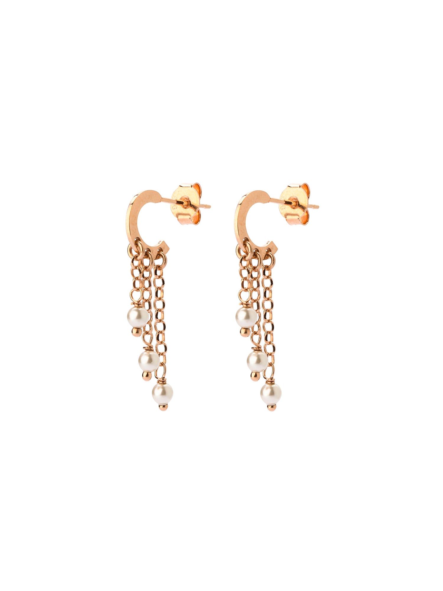 Orecchino Argento Rose' a cerchietto con chiusura a farfallina, con tre fili pendenti asimmetrici e terminale micro perla. Canna piatta e diametro 0,8 cm Prezzo a pezzo singolo. Made in Italy. Le Luci di Gaia Gioielli in Argento 925. Spedizione in tutta Italia