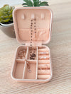 Scatola porta gioie da viaggio, misure 9.5 x 9.5 x 5. Colore rosa, chiusura con cerniera. Interno con divisori porta collane, bracciali, anelli e orecchini. Made in Italy. Le Luci di Gaia Gioielli in Argento 925. Spedizione in tutta Italia